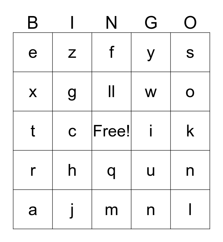 This bingo card has a free space and 29 words: a, b, c, d, e, f, g, h, i, j, k, l, m, n, o, p, q, r, s, t, u, v, w, x, y, z, n, ll and rr.