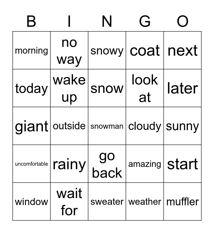 This bingo card has a free space and 24 words: rainy, wait for, snow, window, next, morning, today, no way, cloudy, go back, look at, giant, amazing, start, wake up, weather, sunny, snowy, later, outside, muffler, uncomfortable, coat and sweater.