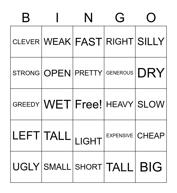 This bingo card has a free space and 25 words: TALL, SHORT, PRETTY, UGLY, SILLY, CLEVER, STRONG, WEAK, HEAVY, LIGHT, GENEROUS, GREEDY, EXPENSIVE, CHEAP, OPEN, CLOSE, SLOW, FAST, DRY, WET, BIG, SMALL, LEFT, RIGHT and TALL.