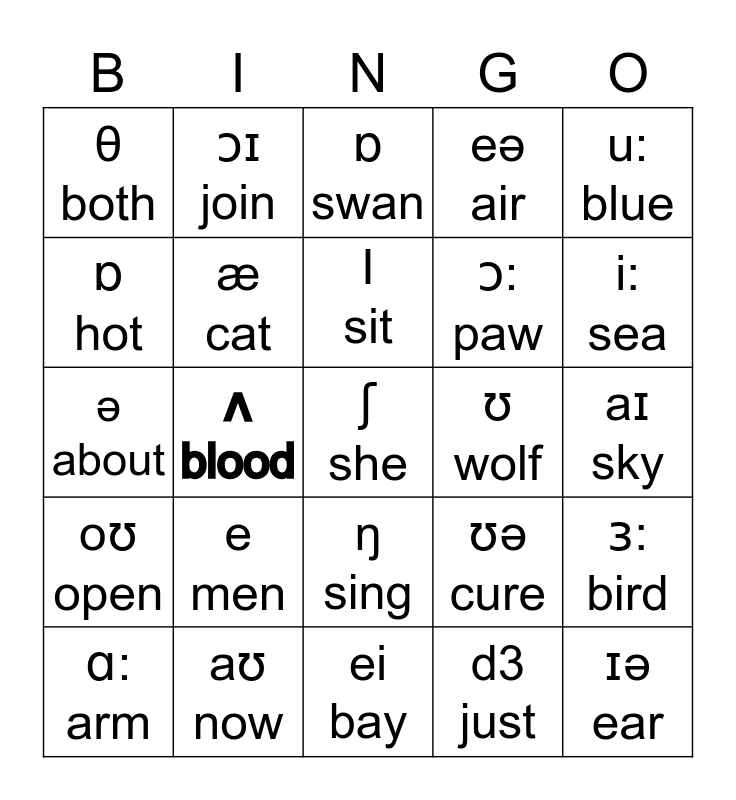 This bingo card has a free space and 24 words: ɑ: arm, e men, I sit, d3 just, u: blue, θ both, ɔɪ join, ɒ swan, ʊ wolf, aɪ sky, ə about, æ cat, ʊə cure, ɜ: bird, ɒ hot, aʊ now, ei bay, eə air, i: sea, oʊ open, ʌ blood, ŋ sing, ɔ: paw and ɪə ear.