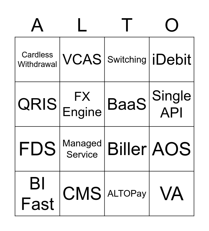 This bingo card has 16 words: BI Fast, CMS, Switching, iDebit, QRIS, VCAS, Biller, AOS, Cardless Withdrawal, FX Engine, ALTOPay, Single API, FDS, Managed Service, BaaS and VA.