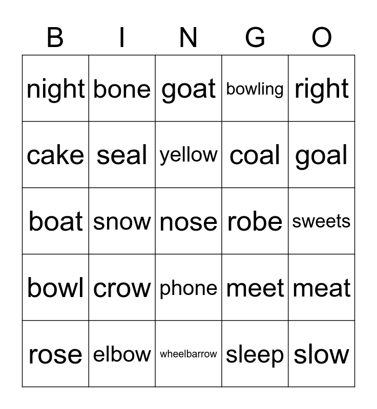 This bingo card has a free space and 24 words: crow, elbow, yellow, rose, right, night, cake, bone, robe, phone, coal, boat, meet, meat, seal, sleep, sweets, goat, goal, snow, slow, bowl, bowling and wheelbarrow.