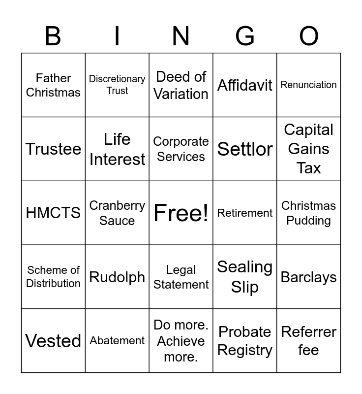 This bingo card has a free space and 44 words: Contingent, Referrer fee, Debtor’s Report, Vested, Escrow, Probate Registry, Deed of Variation, Tax Tracker, Renunciation, Abatement, Affidavit, Retirement, Legal Statement, Rudolph, Administrator, Do more. Achieve more., Turkey, HMCTS, S27 Notices, Capital Gains Tax, Discretionary Trust, IHT, Tinsel, Father Christmas, Snowman, Christmas Pudding, Cheese, Epitome, Sealing Slip, Scheme of Distribution, Reconciliation, Barclays, Isokon, Christmas Party, Cranberry Sauce, Roast Potatoes, Parnsips, Time recording, Corporate Services, Trustee, Settlor, Testator, Life Interest and Baubles.