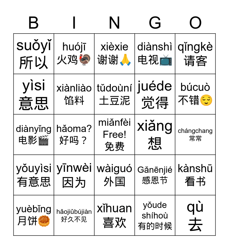This bingo card has a free space and 27 words: Gǎnēnjié 感恩节, Zhōngqiújié中秋节, juéde 觉得, xǐhuan 喜欢, yìsi 意思, xièxie 谢谢🙏, huójī 火鸡🦃️, yǒuyìsi 有意思, xiǎng 想, kànshū 看书, diànyǐng 电影🎬, diànshì 电视📺, yuèbǐng 月饼🥮, hǎojiǔbújiàn好久不见, búcuò 不错😌, nánguāpài 南瓜派🎃, xiànliào 馅料, tǔdoùní 土豆泥, yīnwèi因为, suǒyǐ所以, chángchang常常, yǒude shíhoù 有的时候, hǎoma?好吗?, qù 去, wàiguó外国, qǐngkè请客 and diànziyóuxì电子游戏.