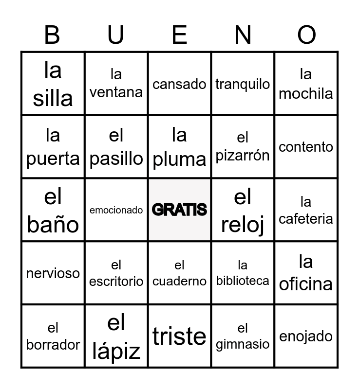 This bingo card has a free space and 24 words: el escritorio, el lápiz, la pluma, el borrador, la mochila, la silla, la puerta, la ventana, el reloj, el cuaderno, el pizarrón, el baño, la biblioteca, la oficina, el pasillo, el gimnasio, la cafeteria, cansado, contento, emocionado, enojado, nervioso, tranquilo and triste.