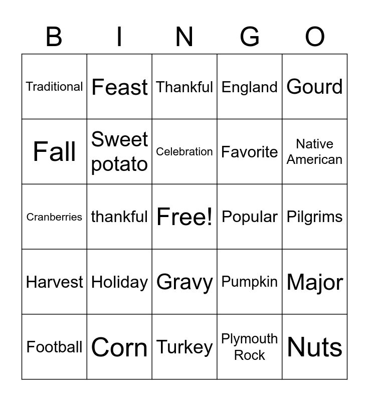 This bingo card has a free space and 31 words: Turkey, Traditional, thankful, Turkey, Traditional, Thankful, Sweet potato, Pumpkin, Popular, Plymouth Rock, Pilgrims, Nuts, November, New World, Native American, Mayflower, Major, Holiday, Harvest, Gravy, Gourd, Fourth, Football, Feast, Favorite, Fall, England, Cranberries, Corn, Celebration and Carve.