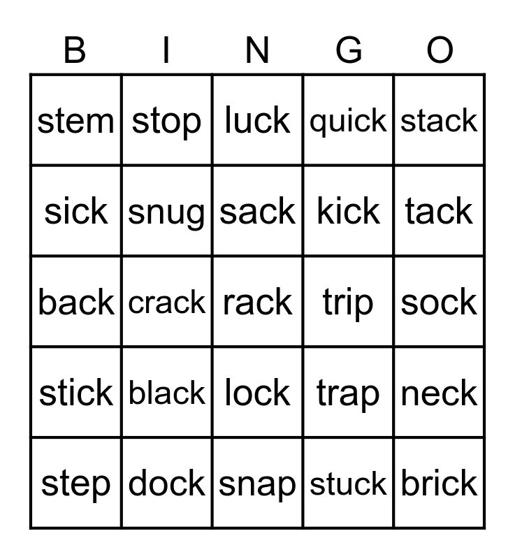This bingo card has 25 words: black, snap, sack, step, stack, stem, sick, stop, trip, lock, kick, back, trap, neck, snug, brick, sock, luck, tack, crack, rack, dock, stick, quick and stuck.