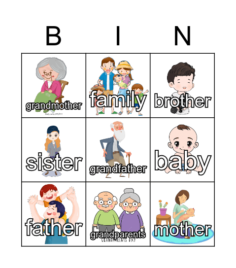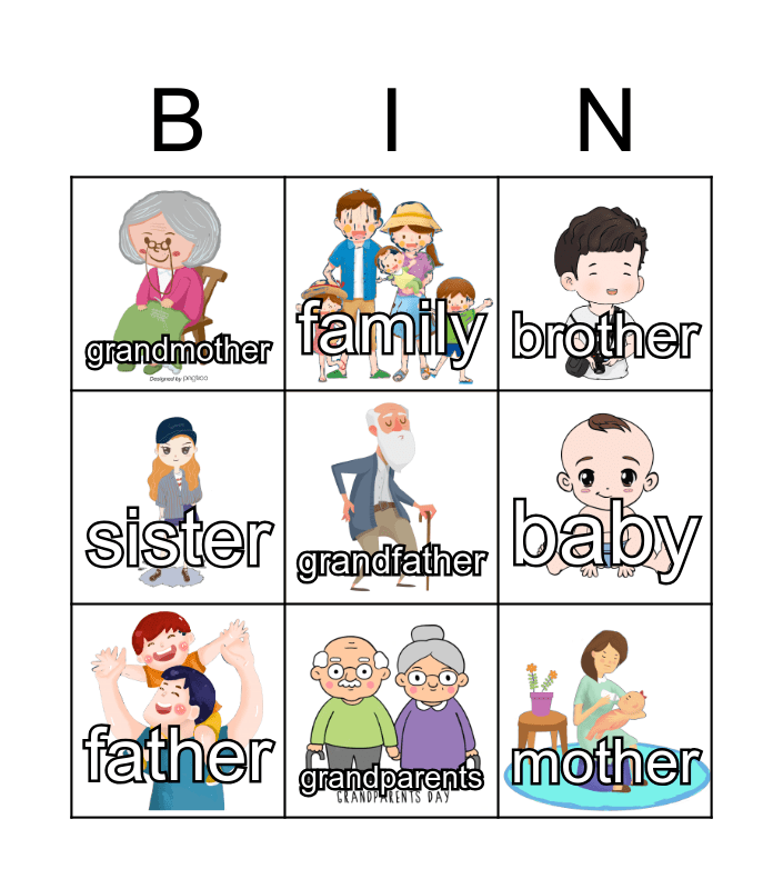This bingo card has 8 images, a free space and 8 words: baby, brother, family, father, grandmother, mother, sister and grandparents.