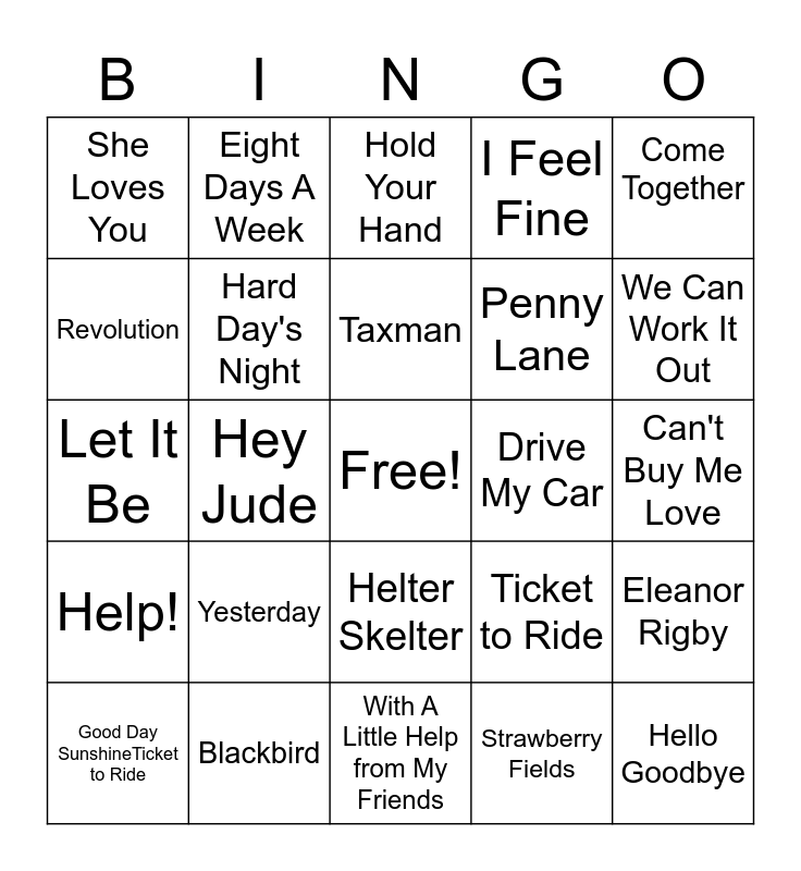 This bingo card has a free space and 24 words: Good Day SunshineTicket to Ride, Yesterday, Taxman, Strawberry Fields, Come Together, She Loves You, Eight Days A Week, Hold Your Hand, Drive My Car, Can't Buy Me Love, Let It Be, Hard Day's Night, Ticket to Ride, Eleanor Rigby, Revolution, Blackbird, With A Little Help from My Friends, I Feel Fine, We Can Work It Out, Help!, Hey Jude, Helter Skelter, Penny Lane and Hello Goodbye.