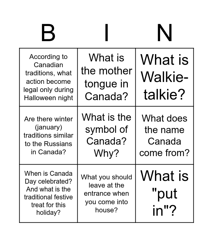 This bingo card has 9 words: When is Canada Day celebrated? And what is the traditional festive treat for this holiday?, What is Walkie-talkie?, What is the mother tongue in Canada?, Are there winter (january) traditions similar to the Russians in Canada?, According to Canadian traditions, what action become legal only during Halloween night, What does the name Canada come from?, What is the symbol of Canada? Why?, What is "put in"? and What you should leave at the entrance when you come into house?.