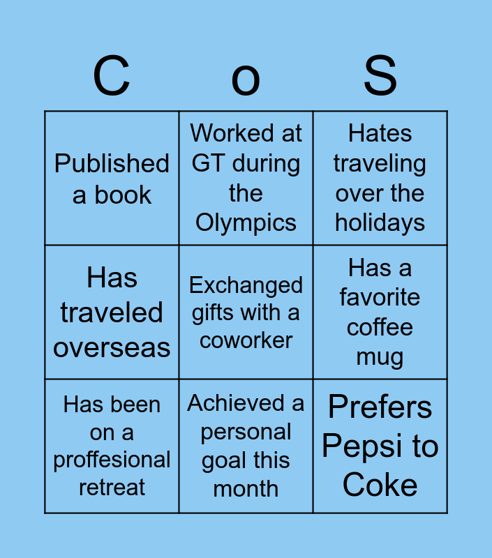 This bingo card has a free space and 27 words: Pranked a coworker this past April Fool's Day, Does not drink coffee, Attended the Lunar Eclipse Viewing in 2017, Has seen Wakanda Forever, Has a favorite coffee mug, Hates traveling over the holidays, Worked at GT during the Olympics, Has met at least 5 famous people, Has been recognized for an achievement within the past year, Led a volunteer project, Worked at GT for 2 years or more, Has traveled overseas, Wears contacts, Completed a book in the last month, Arrived late for a job interview, Fluent in more than one language, Has been on a proffesional retreat, Achieved a personal goal this month, Prefers tea over coffee, Published a book, Grow food in your own garden, Has a pet other than a cat or dog, Enjoys long road trips, Has been to atleast 5 national parks, Enjoys scary movies, Prefers Pepsi to Coke and Still owns a VHS players and VHS tapes.