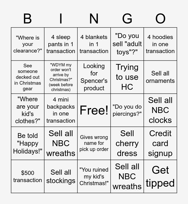 This bingo card has a free space and 25 words: Sell all NBC wreaths, "You ruined my kid's Christmas!", Looking for Spencer's product, $500 transaction, 4 hoodies in one transaction, "Where is your clearance?", See someone decked out in Christmas gear, 4 sleep pants in 1 transaction, "Do you do piercings?", Gives wrong name for pick up order, Trying to use HC, "Where are your kid's clothes?", Sell cherry dress, Credit card signup, "WDYM my order won't arrive by Christmas?" (week before christmas), $100 web order, Sell all NBC clocks, 4 blankets in 1 transaction, Sell all ornaments, 4 mini backpacks in one transaction, Get tipped, Sell all stockings, Be told "Happy Holidays!", "Do you sell "adult toys"?" and Sell all NBC wreaths.