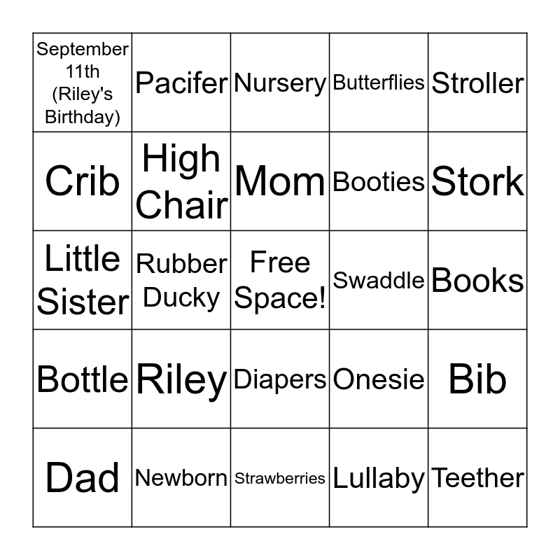 This bingo card has a free space and 24 words: Riley, Newborn, Mom, Dad, Stroller, September 11th (Riley's Birthday), Crib, Pacifer, Swaddle, Diapers, Booties, Little Sister, Onesie, Bib, High Chair, Lullaby, Books, Nursery, Stork, Rubber Ducky, Teether, Bottle, Butterflies and Strawberries.