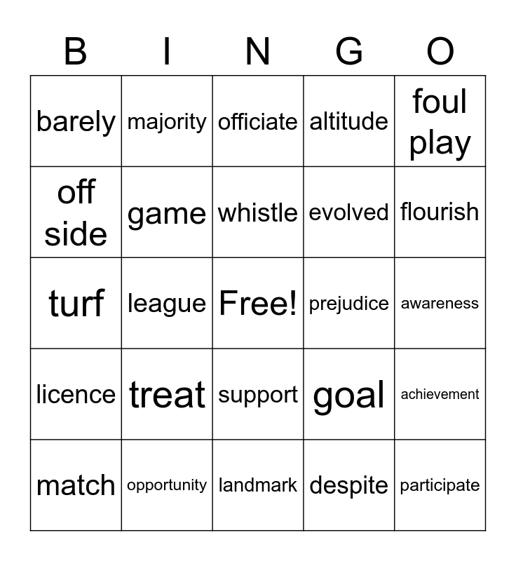 This bingo card has a free space and 39 words: referee, discouraged, proper, game, match, support, whistle, battle, foul play, licence, league, altitude, participate, awareness, prejudice, treat, pitch, barely, worthwhile, goal, off side, landmark, evolved, flourish, gender, challenge, despite, significant, spectators, majority, draw, majority, officiate, opportunity, despite, approved, achievement, turf and stand.