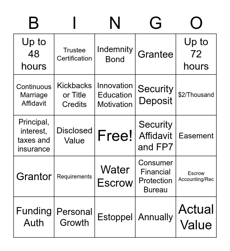 This bingo card has a free space and 24 words: Requirements, Personal Growth, Innovation Education Motivation, Funding Auth, Up to 72 hours, Up to 48 hours, Continuous Marriage Affidavit, Trustee Certification, Security Affidavit and FP7, Water Escrow, Security Deposit, Principal, interest, taxes and insurance, Consumer Financial Protection Bureau, Escrow Accounting/Rec, Kickbacks or Title Credits, Annually, Easement, Indemnity Bond, $2/Thousand, Disclosed Value, Actual Value, Grantor, Grantee and Estoppel.