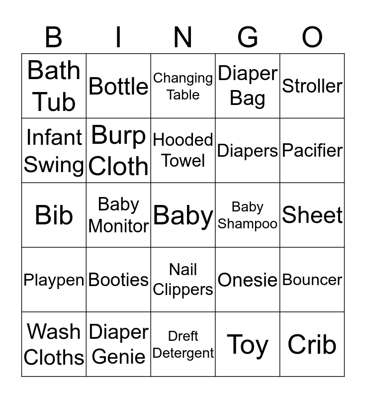 This bingo card has a free space and 48 words: Nursing Pillow, Crib, Rattle, Dreft Detergent, Booties, Outfit, Bottle, Teething Ring, Infant Swing, Bassinet, Burp Cloth, Diaper Bag, Bouncer, Onesie, Baby Book, Book, Hooded Towel, Baby Shampoo, High Chair, Stroller, Baby Monitor, Toy, Bath Tub, Diapers, Car Seat, Pacifier, Wash Cloths, Baby Wipes, Nail Clippers, Playpen, Diaper Cream, Swaddle Blanket, Humidifier, Baby on Board Sign, Diaper Genie, Mittens, Wipes Warmer, Sheet, Mobile, Receiving Blanket, Baby Carrier, Rubber Ducky, Changing Table, Thermometer, Bib, Baby Powder, Bottle Warmer and Baby Hangers.