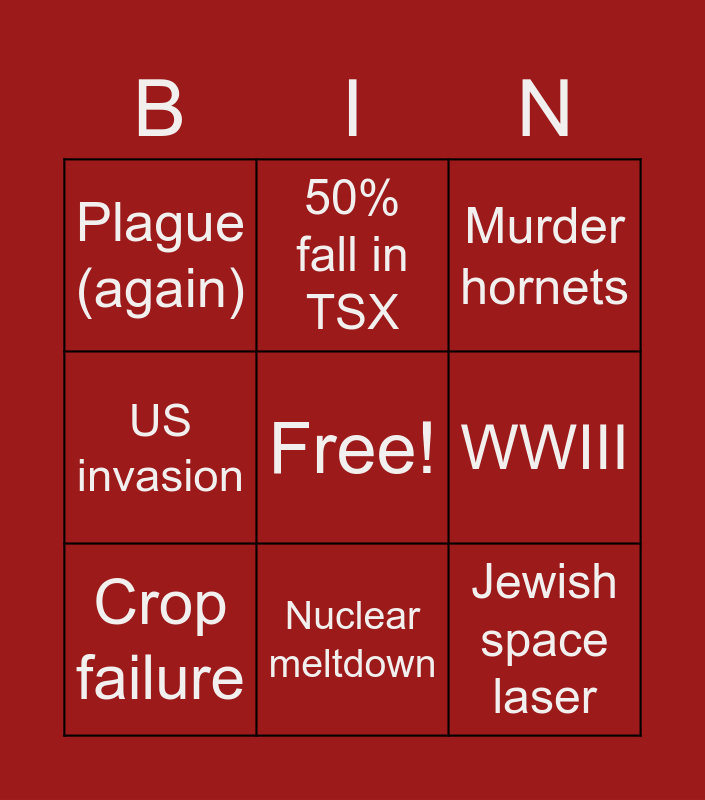 This bingo card has a free space and 8 words: WWIII, Murder hornets, 50% fall in TSX, Crop failure, Plague (again), Jewish space laser, US invasion and Nuclear meltdown.