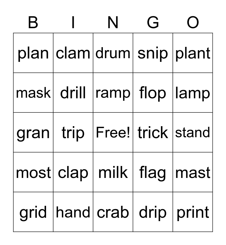 This bingo card has a free space and 29 words: grid, prom, trip, spot, plan, drum, drill, clap, trick, hand, stand, print, crab, drip, lamp, self, milk, most, plant, gran, flag, flip, flop, mask, snip, clam, mast, ramp and band.