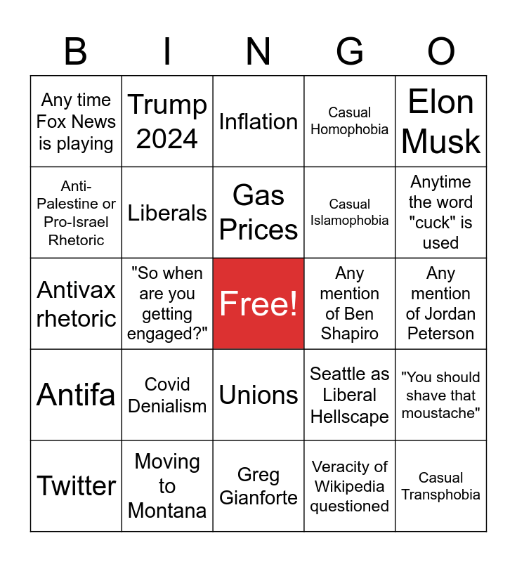 This bingo card has a free space and 33 words: Thin Blue Line/Hero Cop Rhetoric, Lionizing DeSantis, "So when are you getting engaged?", Climate Change as a hoax or overblown, Antifa, Liberals, Elon Musk, Twitter, Trump 2024, Trump Criminal Investigation(s), Gas Prices, Inflation, Kanye West, "Any interesting cases?", Any mention of Ben Shapiro, Anytime the word "cuck" is used, Moving to Montana, Antivax rhetoric, Covid Denialism, Seattle as Liberal Hellscape, Unions, Anytime the word "optionality" is used, Any time Fox News is playing, Any mention of Jordan Peterson, Greg Gianforte, Casual Transphobia, Casual Homophobia, Casual Islamophobia, Anti-Palestine or Pro-Israel Rhetoric, "You should shave that moustache", Being asked to defined fascism, Veracity of Wikipedia questioned and Someone defends an openly fascist politician.