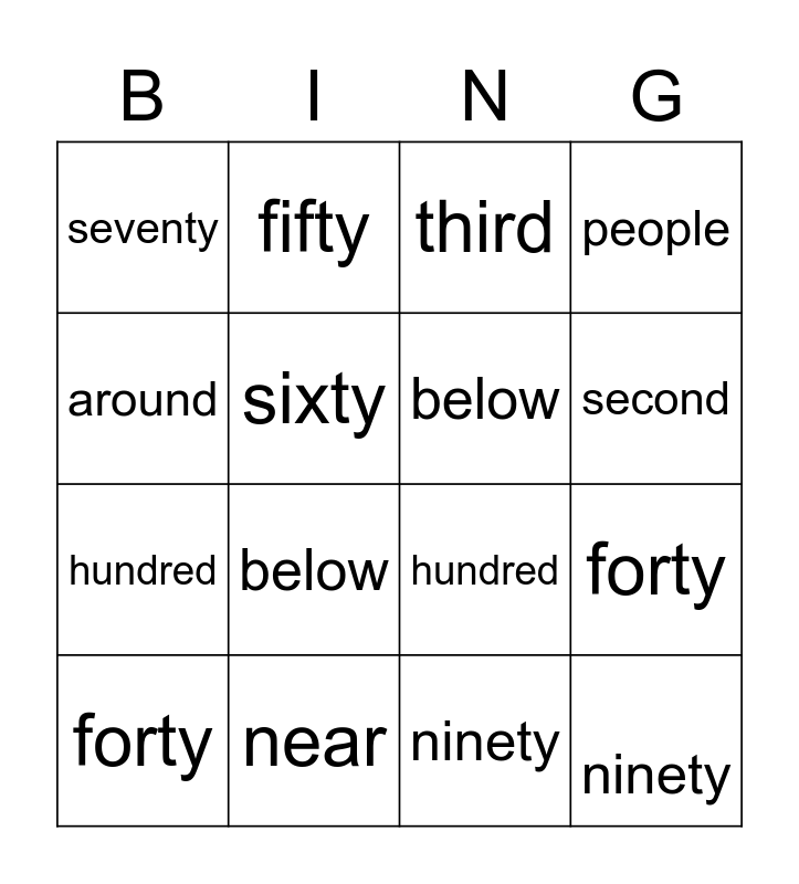 This bingo card has 23 words: ninety, them, second, third, around, seventy, sixty, fifty, forty, away, below, hundred, eighty, people, near, thirty, third, hundred, below, forty, people, ninety and sixty.