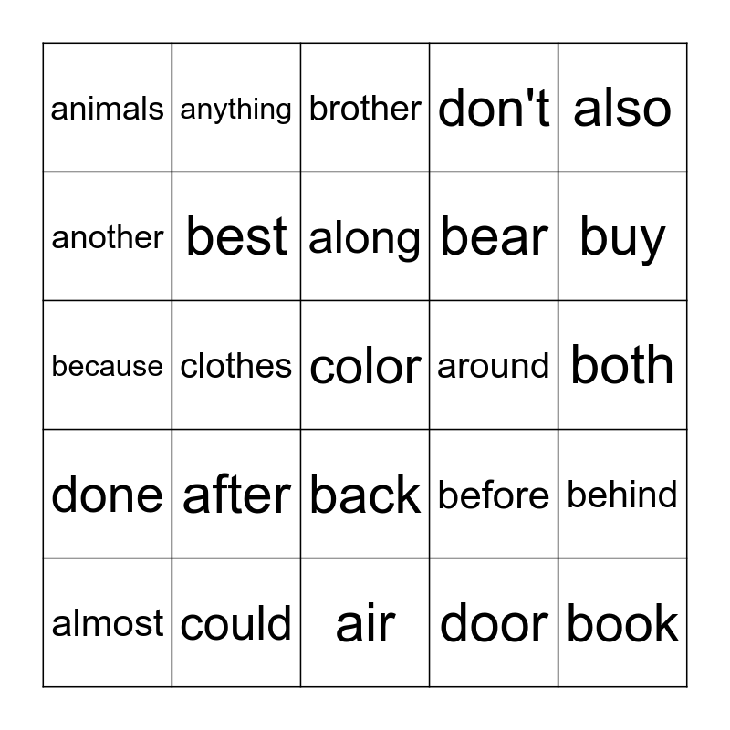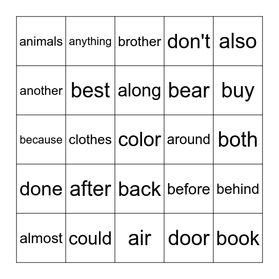 This bingo card has 25 words: after, air, along, almost, also, animals, another, anything, around, back, bear, because, before, behind, best, book, both, brother, buy, clothes, color, could, done, don't and door.