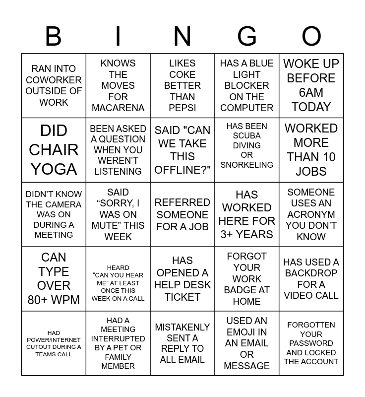 This bingo card has 30 words: HAD A MEETING INTERRUPTED BY A PET OR FAMILY MEMBER, DRIVEN A COWORKER HOME, SAID “SORRY, I WAS ON MUTE” THIS WEEK, HAS NEVER SEEN A STAR WARS FILM, RAN INTO COWORKER OUTSIDE OF WORK, LIKES COKE BETTER THAN PEPSI, BEEN ASKED A QUESTION WHEN YOU WEREN’T LISTENING, HAS OPENED A HELP DESK TICKET, HAS WORKED HERE FOR 3+ YEARS, MISTAKENLY SENT A REPLY TO ALL EMAIL, SOMEONE USES AN ACRONYM YOU DON’T KNOW, REFERRED SOMEONE FOR A JOB, USED AN EMOJI IN AN EMAIL OR MESSAGE, FORGOTTEN YOUR PASSWORD AND LOCKED THE ACCOUNT, WORKED MORE THAN 10 JOBS, BURNT POPCORN IN THE MICROWAVE, FORGOT YOUR WORK BADGE AT HOME, CAN TYPE OVER 80+ WPM, HEARD “CAN YOU HEAR ME” AT LEAST ONCE THIS WEEK ON A CALL, WOKE UP BEFORE 6AM TODAY, DIDN’T KNOW THE CAMERA WAS ON DURING A MEETING, FAMILY CAME TO THE WORKPLACE, KNOWS THE MOVES FOR MACARENA, HAS BEEN SCUBA DIVING OR SNORKELING, DID CHAIR YOGA, HAS A BLUE LIGHT BLOCKER ON THE COMPUTER, HAS USED A BACKDROP FOR A VIDEO CALL, HAD POWER/INTERNET CUTOUT DURING A TEAMS CALL, SAID "CAN WE TAKE THIS OFFLINE?" and HEARD REALLY LOUD TYPING IN THE BACKGROUND (LIKE A HAMMER).