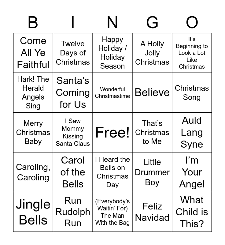 This bingo card has a free space and 106 words: All I Want for Christmas is You, Jingle Bell Rock, It’s Beginning to Look a Lot Like Christmas, Rockin’ Around the Christmas Tree, Silent Night, Here Comes Santa Claus, Deck the Halls, Have Yourself a Merry Little Christmas, It’s the Most Wonderful Time of the Year, White Christmas, Let it Snow! Let it Snow! Let it Snow!, You’re a Mean One, Mr. Grinch, Winter Wonderland, Christmas Time is Here, Frosty the Snowman, Someday at Christmas, Happy Holiday / Holiday Season, Christmas (Baby Please Come Home), Santa Baby, Silver Bells, I Heard the Bells on Christmas Day, Joy to the World, Santa Claus is Comin’ to Town, O Little Town of Bethlehem, Rudolph the Red-Nosed Reindeer, Carol of the Bells, Christmas Song, A Holly Jolly Christmas, Sleigh Ride, Baby It’s Cold Outside, Little Drummer Boy, Feliz Navidad, The Chimpmunk Song, Blue Christmas, O Holy Night, Where Are You Christmas, Christmas Canon, Little Saint Nick, Wonderful Christmastime, Mele Kelikimaka, Do They Know it’s Christmas?, Mary, Did You Know?, Merry Christmas Darling, Caroling, Caroling, Grandma Got Run Over by a Reindeer, Hark! The Herald Angels Sing, Do You Hear What I Hear?, Come All Ye Faithful, Grown-Up Christmas List, What Child is This?, God Rest Ye Merry Gentlemen, Run Rudolph Run, Linus and Lucy, We Wish You a Merry Christmas, Last Christmas, Tannenbaum, Mistletoe and Holly, I Want a Hippopotamus for Christmas, Silver and Gold, Twelve Days of Christmas, Happy Xmas (the War is Over), I’ve Got My Love to Keep Me Warm, A Marshmallow World, It Came Upon a Midnight Clear, The First Noel, Merry Christmas, Happy Holidays, I’ll Be Home for Christmas, We Need a Little Christmas, Believe, Merry Christmas Baby, I Saw Mommy Kissing Santa Claus, (Everybody’s Waitin’ For) The Man With the Bag, Up on the House Top, Ding Dong! Merrily on High, Snoopy’s Christmas, What Christmas Means to Me, Christmas All Over Again, Jingle Jingle Jingle, We Wish You the Merriest, Somewhere in My Memory, My Favorite Things, We Three Kings, The Day That Love Began, Jolly Old Saint Nicholas, The Christmas Shoes, Christmas Memories, That’s Christmas to Me, Tennessee Christmas, A Christmas to Remember, Breath of Heaven, Emmanuel, God With Us, Love Has Come, Ave Maria, The Magic of Christmas Day, The Prayer, I’m Your Angel, The Christmas Waltz, An Old Fashioned Christmas, Jesus Born on This Day, Auld Lang Syne, Santa’s Coming for Us, Hallelujah, Angels We Have Heard on High, This Christmas, Jingle Bells and All I Want For Christmas is My Two Front Teeth.