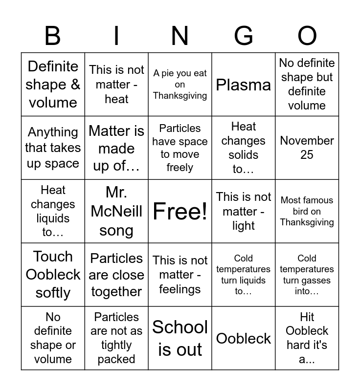 This bingo card has a free space and 24 words: Particles are close together, Particles are not as tightly packed, Particles have space to move freely, No definite shape or volume, No definite shape but definite volume, Definite shape & volume, Anything that takes up space, This is not matter - heat, This is not matter - light, This is not matter - feelings, Heat changes solids to…, Heat changes liquids to…, Cold temperatures turn liquids to…, Cold temperatures turn gasses into…, Matter is made up of…, Oobleck, Most famous bird on Thanksgiving, A pie you eat on Thanksgiving, November 25, Mr. McNeill song, Hit Oobleck hard it's a..., Touch Oobleck softly, Plasma and School is out.
