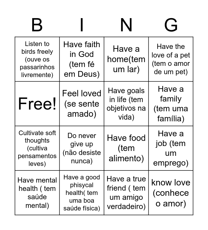 This bingo card has 16 words: Have a good phisycal health( tem uma boa saúde física), Have a job (tem um emprego), Have a home(tem um lar), Listen to birds freely (ouve os passarinhos livremente), Cultivate soft thoughts (cultiva pensamentos leves), Have faith in God (tem fé em Deus), Have food (tem alimento), Have a true friend ( tem um amigo verdadeiro), Free!, Feel loved (se sente amado), Have mental health ( tem saúde mental), Have the love of a pet (tem o amor de um pet), Do never give up (não desiste nunca), Have a family (tem uma família), Have goals in life (tem objetivos na vida) and know love (conhece o amor).
