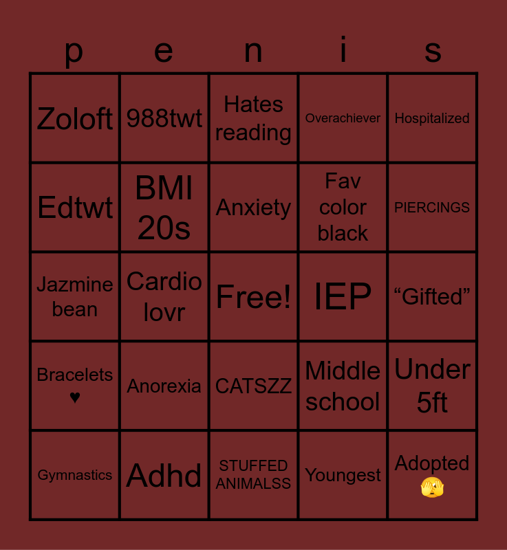 This bingo card has a free space and 24 words: Anorexia, Adhd, Anxiety, Gymnastics, Hospitalized, Zoloft, Edtwt, 988twt, IEP, CATSZZ, Fav color black, Jazmine bean, Middle school, Under 5ft, BMI 20s, Youngest, “Gifted”, Hates reading, PIERCINGS, Cardio lovr, Adopted 🫣, Bracelets ♥️, Overachiever and STUFFED ANIMALSS.