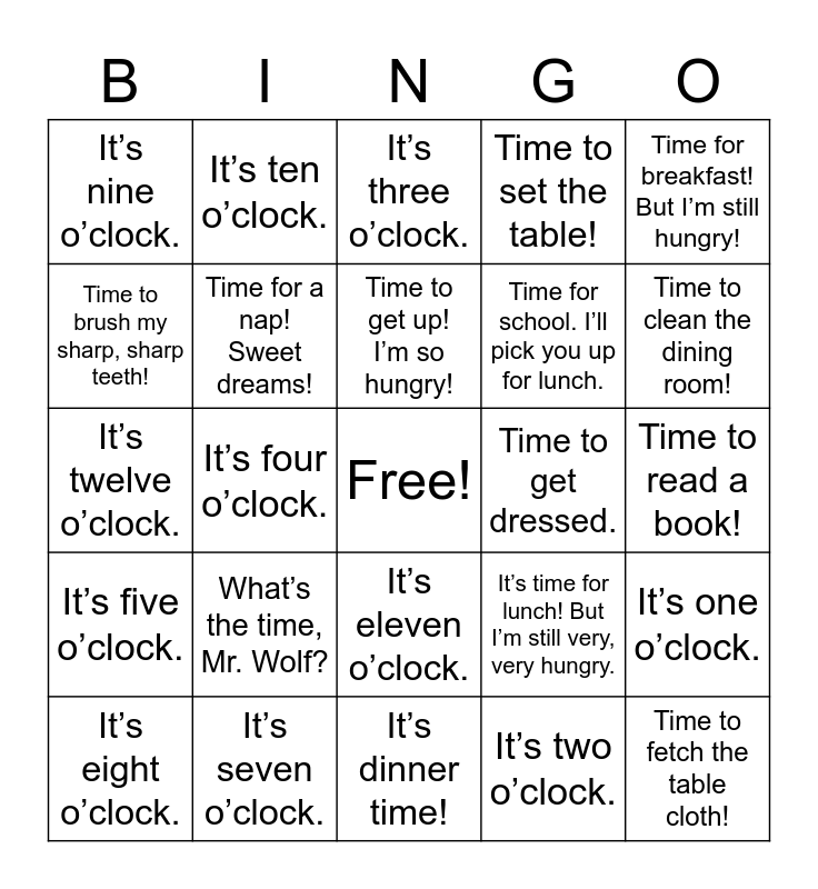 This bingo card has a free space and 24 words: What’s the time, Mr. Wolf?, It’s seven o’clock., Time to get up! I’m so hungry!, It’s eight o’clock., Time for breakfast! But I’m still hungry!, It’s nine o’clock., Time to brush my sharp, sharp teeth!, It’s ten o’clock., Time to get dressed., It’s eleven o’clock., Time for school. I’ll pick you up for lunch., It’s twelve o’clock., It’s time for lunch! But I’m still very, very hungry., It’s one o’clock., Time for a nap! Sweet dreams!, It’s two o’clock., Time to read a book!, It’s three o’clock., Time to clean the dining room!, It’s four o’clock., Time to fetch the table cloth!, It’s five o’clock., Time to set the table! and It’s dinner time!.