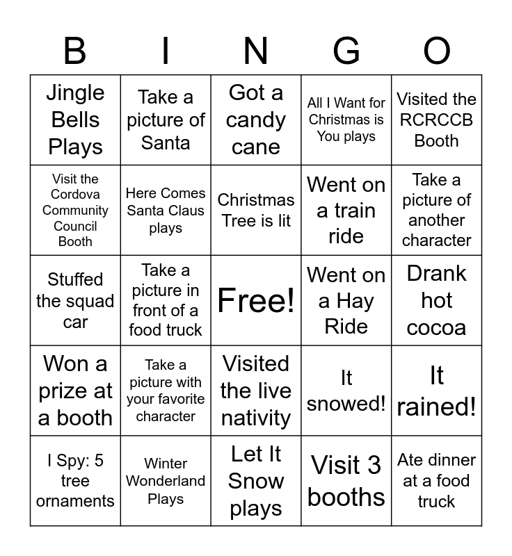 This bingo card has a free space and 24 words: Take a picture with your favorite character, Winter Wonderland Plays, Christmas Tree is lit, I Spy: 5 tree ornaments, Visited the RCRCCB Booth, Jingle Bells Plays, Visit the Cordova Community Council Booth, Take a picture of Santa, Went on a Hay Ride, Visited the live nativity, Went on a train ride, Stuffed the squad car, It snowed!, It rained!, Here Comes Santa Claus plays, Visit 3 booths, Drank hot cocoa, Got a candy cane, Take a picture of another character, Take a picture in front of a food truck, Ate dinner at a food truck, Won a prize at a booth, All I Want for Christmas is You plays and Let It Snow plays.