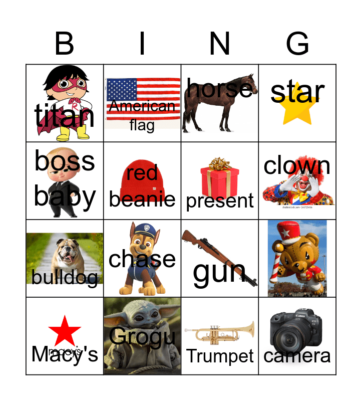 This bingo card has 21 images and 20 words: Grogu, balloons, American flag, police officer, Trumpet, present, titan, horse, gun, clown, bulldog, star, camera, wimpy kid, red beanie, cheerleader, Macy's, chase, boss baby and top hat.