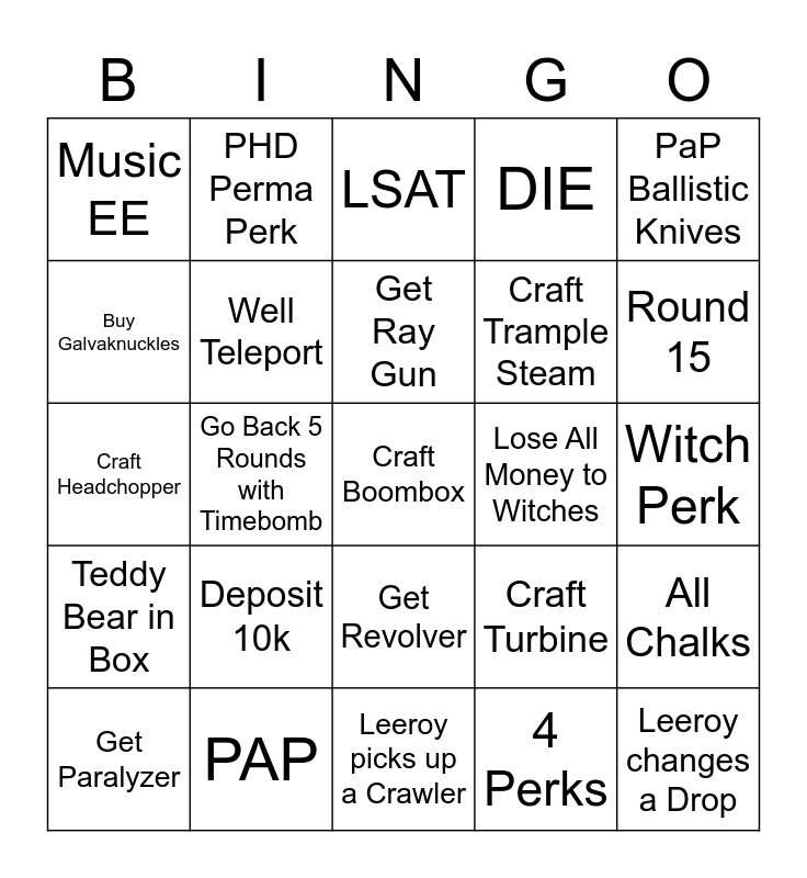 This bingo card has a free space and 24 words: Deposit 10k, PAP, Get Ray Gun, Get Paralyzer, PaP Ballistic Knives, Music EE, Buy Galvaknuckles, PHD Perma Perk, Lose All Money to Witches, Get Revolver, Craft Trample Steam, Craft Headchopper, Craft Turbine, All Chalks, Well Teleport, 4 Perks, Witch Perk, LSAT, Round 15, Go Back 5 Rounds with Timebomb, Leeroy changes a Drop, Teddy Bear in Box, DIE and Leeroy picks up a Crawler.