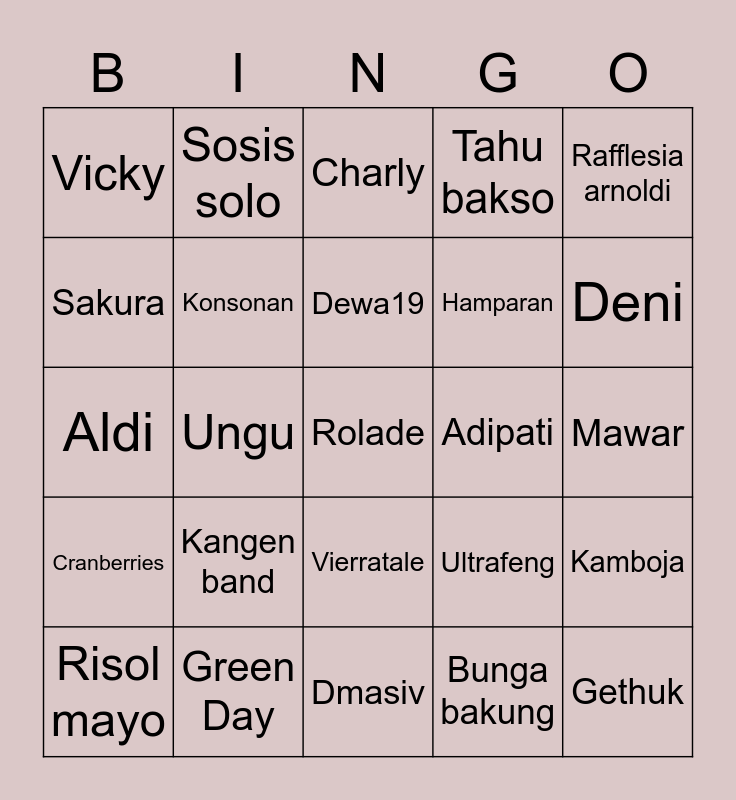 This bingo card has a free space and 24 words: Risol mayo, Kangen band, Dewa19, Bunga bakung, Rafflesia arnoldi, Vicky, Sosis solo, Charly, Adipati, Mawar, Aldi, Konsonan, Ultrafeng, Kamboja, Sakura, Green Day, Dmasiv, Tahu bakso, Deni, Cranberries, Ungu, Vierratale, Hamparan and Gethuk.