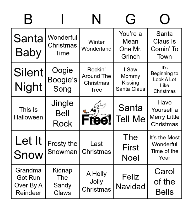 This bingo card has a free space and 40 words: All I Want For Christmas Is You, This Is Halloween, What’s This?, Oogie Boogie’s Song, Kidnap The Sandy Claws, Last Christmas, Rockin’ Around The Christmas Tree, Sleigh Ride, Santa Claus Is Comin’ To Town, Let It Snow, Jingle Bell Rock, You’re a Mean One Mr. Grinch, Carol of the Bells, Have Yourself a Merry Little Christmas, Santa Tell Me, Frosty the Snowman, Jingle Bells, Santa Baby, Run, Rudolph, Run, Winter Wonderland, It’s the Most Wonderful Time of the Year, Feliz Navidad, I Saw Mommy Kissing Santa Claus, Silent Night, O’ Holy Night, Little Drummer Boy, Blue Christmas, The Christmas Song, White Christmas, Deck the Halls, Rudolph the Red-Nosed Reindeer, Grandma Got Run Over By A Reindeer, Baby, It’s Cold Outside, The First Noel, It’s Beginning to Look A Lot Like Christmas, A Holly Jolly Christmas, Here Comes Santa Claus, Please Come Home For Christmas, Wonderful Christmas Time and Monster Mash.