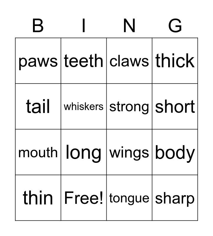 This bingo card has 16 words: Free!, body, claws, paws, mouth, teeth, wings, tongue, tail, whiskers, thin, thick, long, short, strong and sharp.