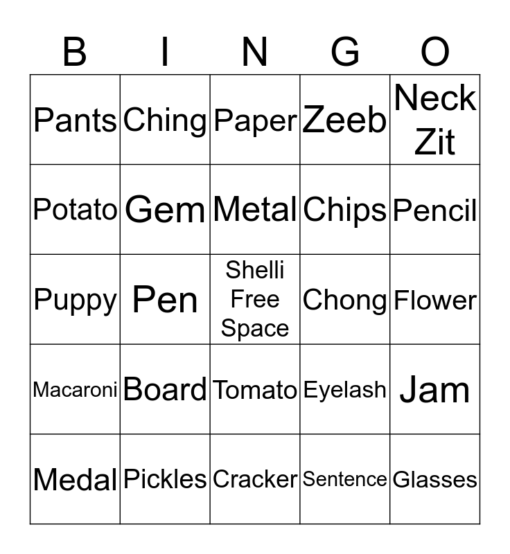This bingo card has a free space and 24 words: Board, Pickles, Metal, Medal, Neck Zit, Pants, Potato, Ching, Chong, Tomato, Chips, Puppy, Eyelash, Jam, Gem, Sentence, Flower, Paper, Pencil, Pen, Glasses, Macaroni, Zeeb and Cracker.