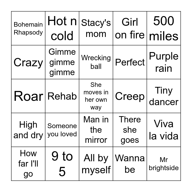 This bingo card has a free space and 24 words: Someone you loved, 9 to 5, Wrecking ball, How far I'll go, 500 miles, Bohemain Rhapsody, Crazy, Hot n cold, Creep, Man in the mirror, Perfect, Roar, There she goes, Viva la vida, Gimme gimme gimme, Wanna be, Tiny dancer, Stacy's mom, Purple rain, Rehab, Mr brightside, High and dry, Girl on fire and All by myself.