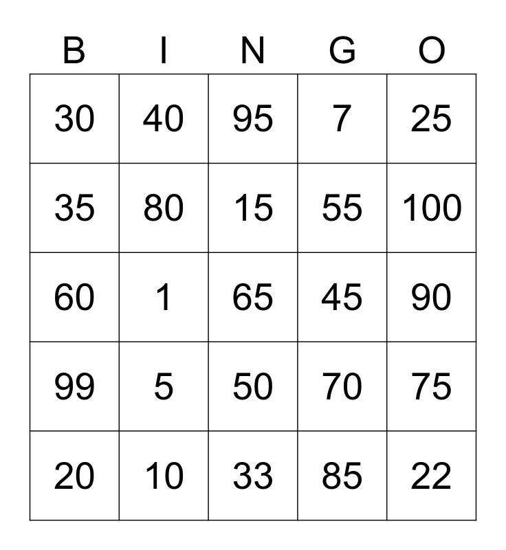 This bingo card has a free space and 24 words: 5, 10, 15, 20, 25, 30, 35, 40, 45, 50, 55, 60, 70, 75, 80, 85, 90, 95, 100, 1, 22, 99, 7 and 33.