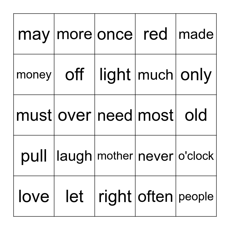 This bingo card has a free space and 24 words: laugh, let, light, love, made, may, money, more, most, mother, much, must, never, o'clock, off, often, old, once, only, over, people, pull, red and right.
