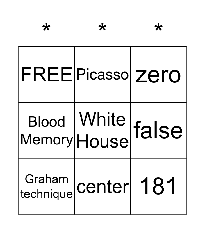 This bingo card has 9 words: Graham technique, zero, Picasso, Blood Memory, FREE, false, White House, 181 and center.