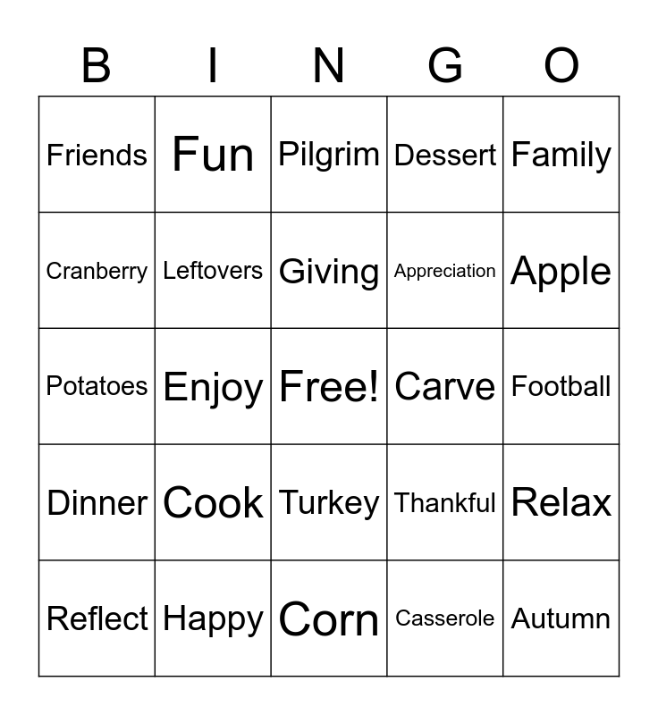 This bingo card has a free space and 26 words: Turkey, Casserole, Giving, Happy, Family, Friends, Cranberry, Fun, Football, Thankful, Appreciation, Potatoes, Relax, Reflect, Enjoy, Pie, Dessert, Dinner, Pilgrim, Autumn, Apple, Corn, Carve, Cook, Leftovers and Meal.