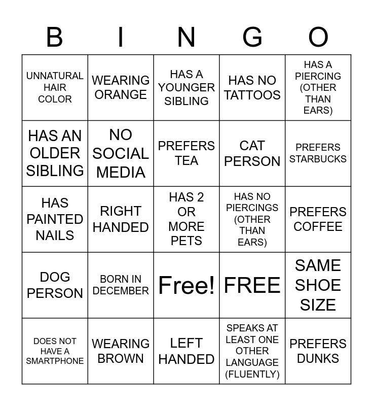 This bingo card has 26 words: Free!, SPEAKS AT LEAST ONE OTHER LANGUAGE (FLUENTLY), PREFERS TEA, WEARING BROWN, HAS A PIERCING (OTHER THAN EARS), UNNATURAL HAIR COLOR, HAS AN OLDER SIBLING, WEARING ORANGE, PREFERS COFFEE, FREE, CAT PERSON, HAS PAINTED NAILS, SAME SHOE SIZE, DOES NOT HAVE A SMARTPHONE, RIGHT HANDED, HAS AN ANIMAL TATTOO, HAS NO TATTOOS, DOG PERSON, HAS A YOUNGER SIBLING, HAS 2 OR MORE PETS, PREFERS STARBUCKS, LEFT HANDED, HAS NO PIERCINGS (OTHER THAN EARS), BORN IN DECEMBER, NO SOCIAL MEDIA and PREFERS DUNKS.