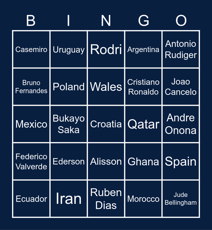 This bingo card has 66 words: Free!, Serbia, South Korea, Spain, Switzerland, Tunisia, Uruguay, USA, Wales, Alexander Trent, Alisson, Alphonso Davies, Andre Onona, Antonio Rudiger, Bernardo Silva, Bruno Fernandes, Bukayo Saka, Casemiro, Christian Eriksen, Cristiano Ronaldo, Ederson, Federico Valverde, Argentina, Australia, Belgium, Brazil, Cameroon, Costa Rica, Croatia, Denmark, Ecuador, England, France, Germany, Ghana, Iran, Japan, Mexico, Morocco, Netherlands, Poland, Portugal, Qatar, Gabriel Jesus, Gavi, Harry Kane, Joao Cancelo, Joshua Kimmich, Jude Bellingham, Kalidou Koulibaly, Kevin De Bruyne, Lautaro Martinez, Lionel Messi, Manuel Neuer, Neymar, Pedri, Phil Foden, Robert Lewandowski, Rodri, Ruben Dias, Sadio Mane, Thomas muller, Virgil van Dijk, Saudi Arabia, Senegal and Frenkie De Jong.