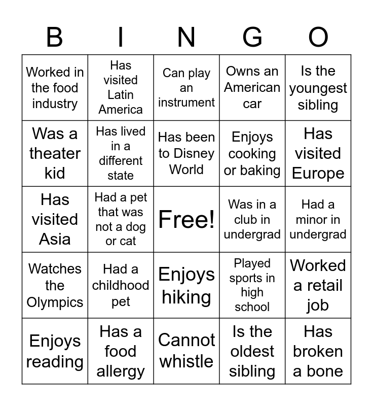 This bingo card has a free space and 24 words: Had a childhood pet, Has a food allergy, Has been to Disney World, Enjoys reading, Is the youngest sibling, Worked in the food industry, Was a theater kid, Has visited Latin America, Was in a club in undergrad, Enjoys hiking, Enjoys cooking or baking, Has visited Asia, Played sports in high school, Worked a retail job, Has lived in a different state, Is the oldest sibling, Had a minor in undergrad, Can play an instrument, Has visited Europe, Had a pet that was not a dog or cat, Has broken a bone, Watches the Olympics, Owns an American car and Cannot whistle.