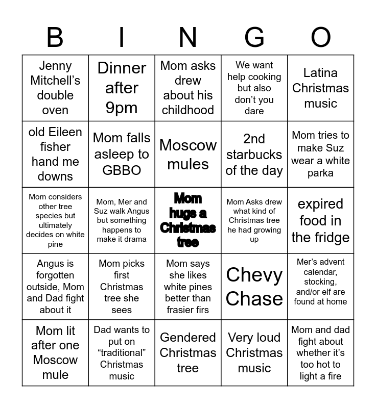 This bingo card has a free space and 24 words: Mom picks first Christmas tree she sees, Dad wants to put on “traditional” Christmas music, Moscow mules, Mom lit after one Moscow mule, Latina Christmas music, Jenny Mitchell’s double oven, old Eileen fisher hand me downs, Dinner after 9pm, Mom Asks drew what kind of Christmas tree he had growing up, Mom says she likes white pines better than frasier firs, 2nd starbucks of the day, Mom considers other tree species but ultimately decides on white pine, Chevy Chase, Mer’s advent calendar, stocking, and/or elf are found at home, Mom falls asleep to GBBO, Very loud Christmas music, expired food in the fridge, Mom asks drew about his childhood, Mom tries to make Suz wear a white parka, Mom, Mer and Suz walk Angus but something happens to make it drama, Mom and dad fight about whether it’s too hot to light a fire, Angus is forgotten outside, Mom and Dad fight about it, We want help cooking but also don’t you dare and Gendered Christmas tree.