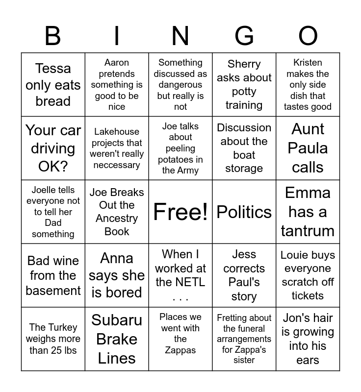 This bingo card has a free space and 30 words: Subaru Brake Lines, Jess Drinks 4 Glasses of Wine, Joe Breaks Out the Ancestry Book, Vito Growls at Someone, Tessa only eats bread, Something discussed as dangerous but really is not, Lakehouse projects that weren't really neccessary, When I worked at the NETL . . ., Politics, Places we went with the Zappas, Emma has a tantrum, Jon's hair is growing into his ears, Fretting about the funeral arrangements for Zappa's sister, There are multiple side dishes made without onions, Aunt Paula calls, Cancer, Jess corrects Paul's story, Bad wine from the basement, Anna says she is bored, Kristen makes the only side dish that tastes good, Joelle tells everyone not to tell her Dad something, Tessa and Emma fight, Aaron pretends something is good to be nice, Discussion about the boat storage, Your car driving OK?, Sherry asks about potty training, Louie buys everyone scratch off tickets, The Turkey weighs more than 25 lbs, Joe talks about peeling potatoes in the Army and Paul gets the turkey farts.