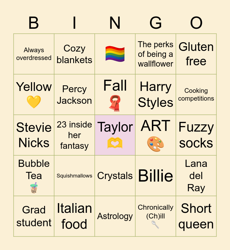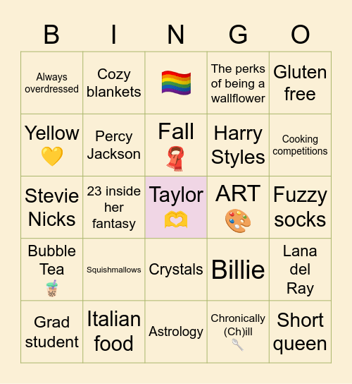 This bingo card has a free space and 24 words: Squishmallows, Italian food, Fall 🧣, Grad student, Gluten free, Always overdressed, Yellow 💛, Cozy blankets, ART🎨, Crystals, Harry Styles, Stevie Nicks, Billie, Lana del Ray, Percy Jackson, Chronically (Ch)ill 🥄, Fuzzy socks, 🏳️🌈, Cooking competitions, 23 inside her fantasy, Short queen, Bubble Tea 🧋, The perks of being a wallflower and Astrology.