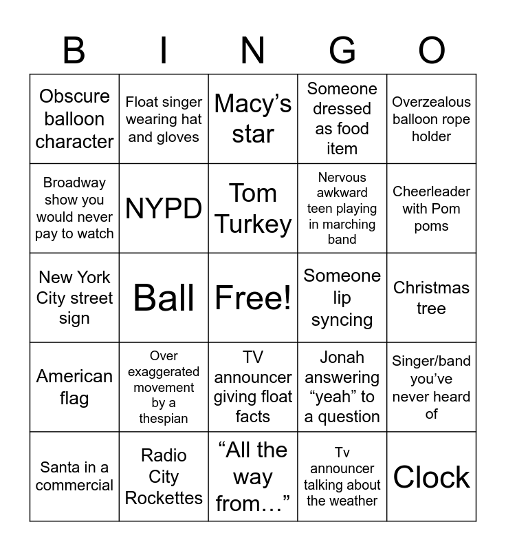 This bingo card has a free space and 24 words: Over exaggerated movement by a thespian, Radio City Rockettes, Tom Turkey, Santa in a commercial, Overzealous balloon rope holder, Obscure balloon character, Broadway show you would never pay to watch, Float singer wearing hat and gloves, Someone lip syncing, TV announcer giving float facts, Nervous awkward teen playing in marching band, New York City street sign, Jonah answering “yeah” to a question, Singer/band you’ve never heard of, NYPD, Tv announcer talking about the weather, Christmas tree, Macy’s star, Cheerleader with Pom poms, Ball, Clock, American flag, Someone dressed as food item and “All the way from…”.